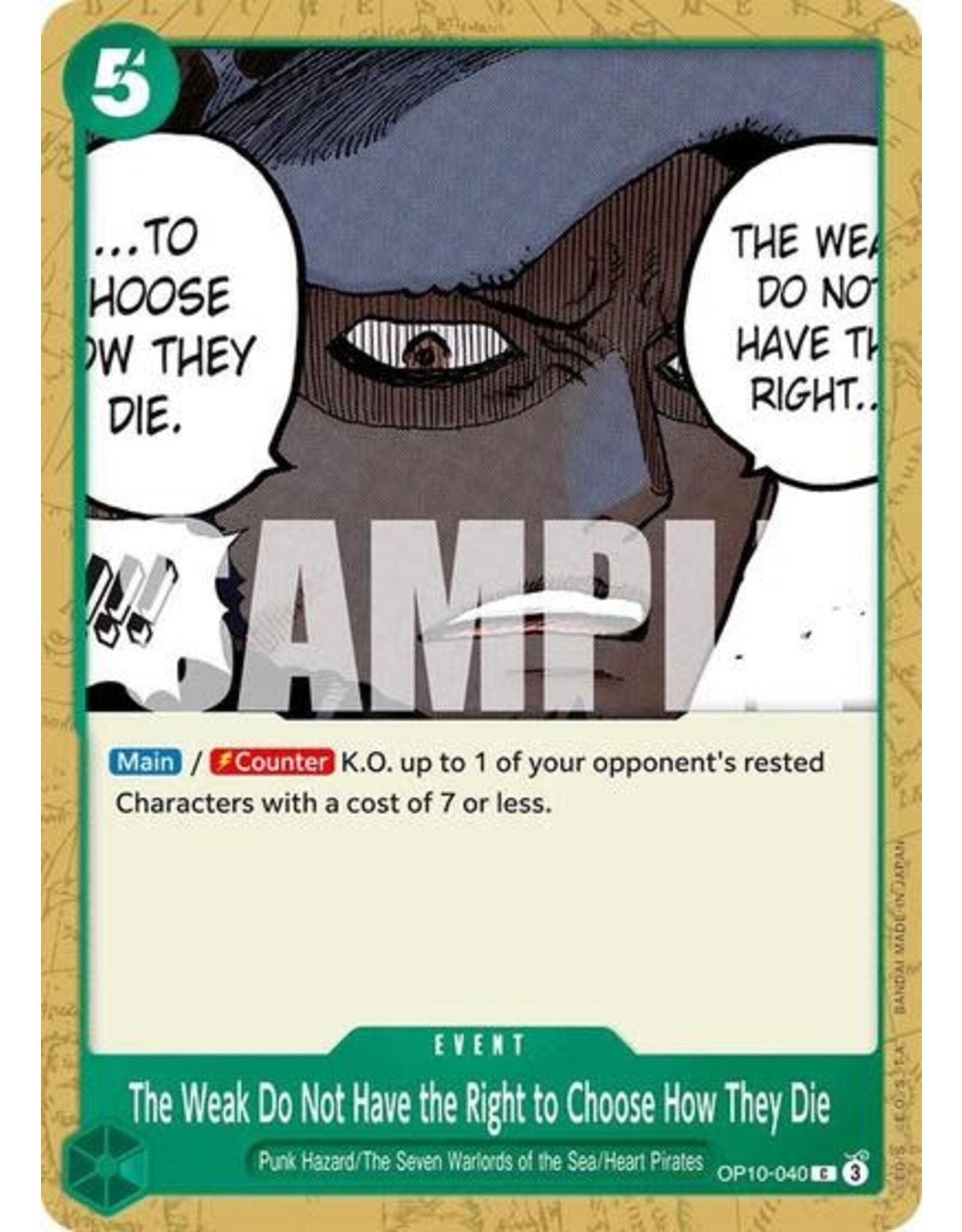 | Description | [Main]/[Counter] K.O. up to 1 of your opponent's rested Characters with a cost of 7 or less. |